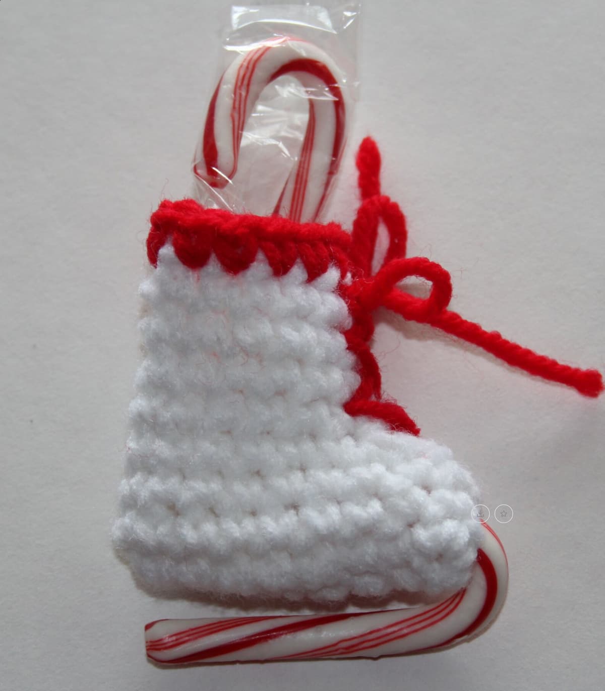 It’s part of a set of three festive crochet designs that all fit mini candy canes – there’s a tiny Santa hat, a little stocking, and of course this sweet ice skate with a candy blade.