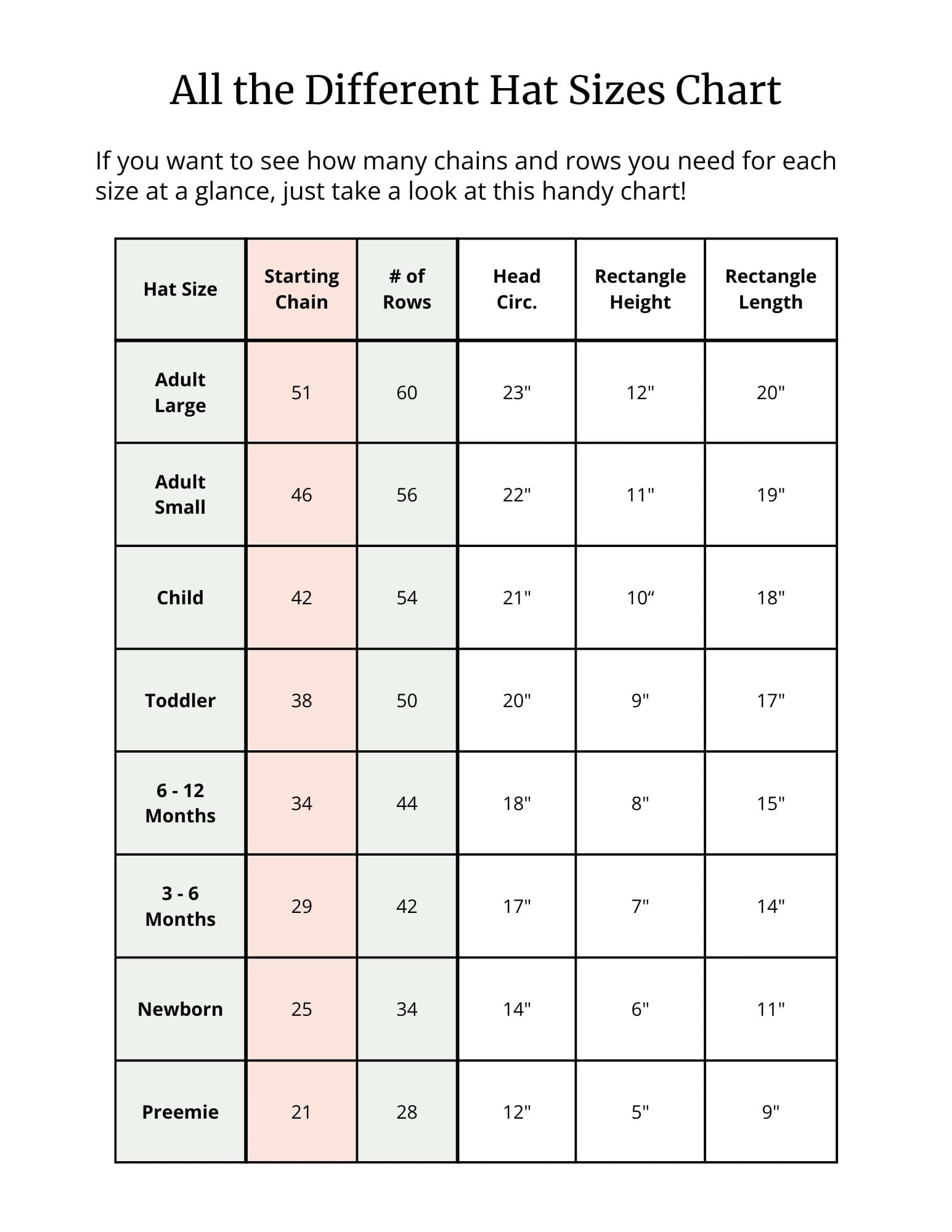 To make things even easier, I made a quick, visual chart with all the starting chain amounts and row counts for each size of hat.